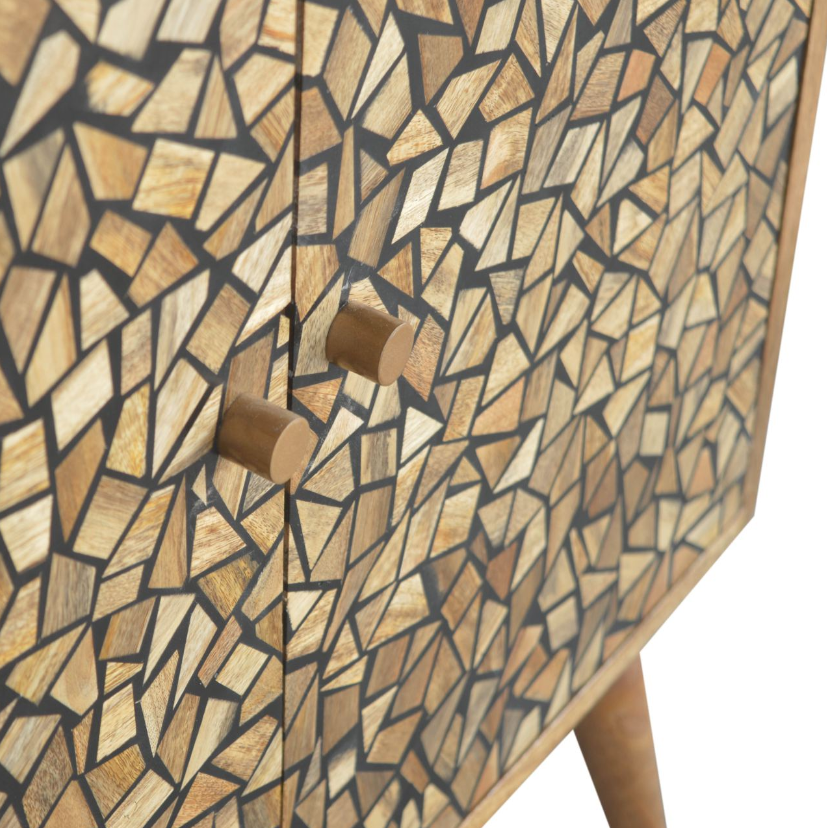 Handcrafted from sustainably sourced solid mango wood, the cabinet stands on Nordic-inspired tapered legs with polished brass knobs. The standout feature? The front doors feature resin inlays arranged in a dimensional mosaic pattern—each piece is unique, reflecting meticulous artisanal skill